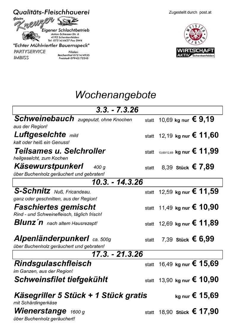 Fleischerei KREUZER, Qualitäts-Fleischhauerei, eigener Schlachtbetrieb, echter Mühlviertler Bauernspeck.